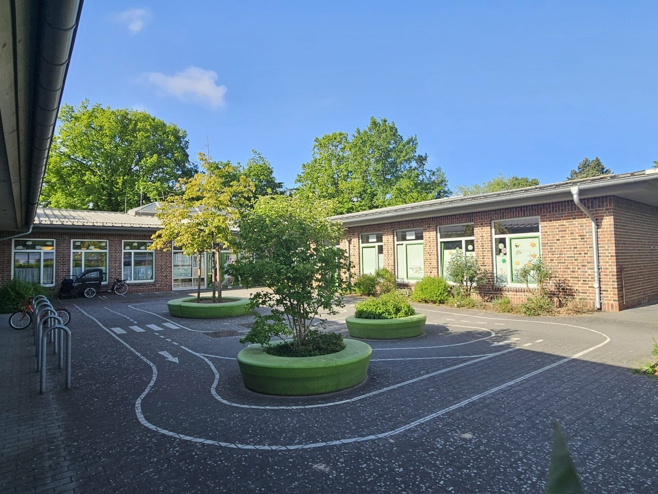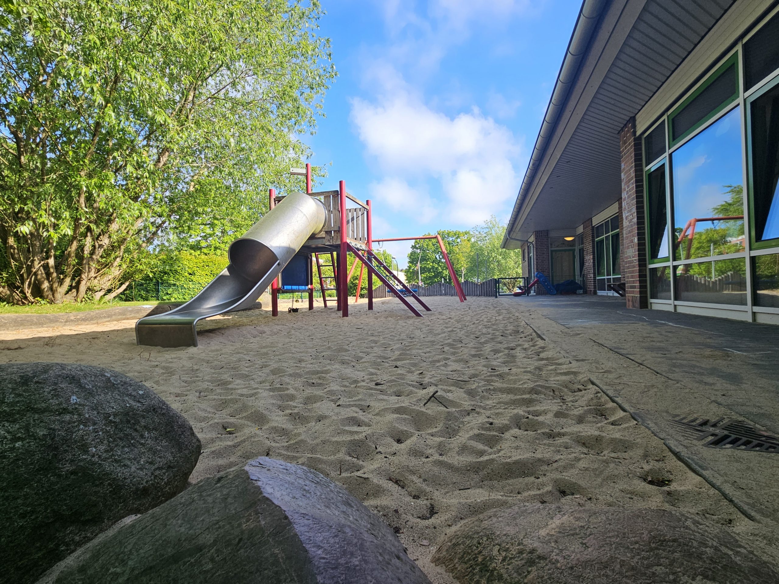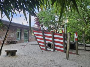 Die Kita ist umgeben von einem Außengelände mit vielfältigen Spielmöglichkeiten. Neben den üblichen Rutschen, Schaukel, Sandkisten etc. gibt es eine „Tarzanbrücke“, ein Spielschiff und einen „Verkehrsplatz“ für Fahrzeuge.