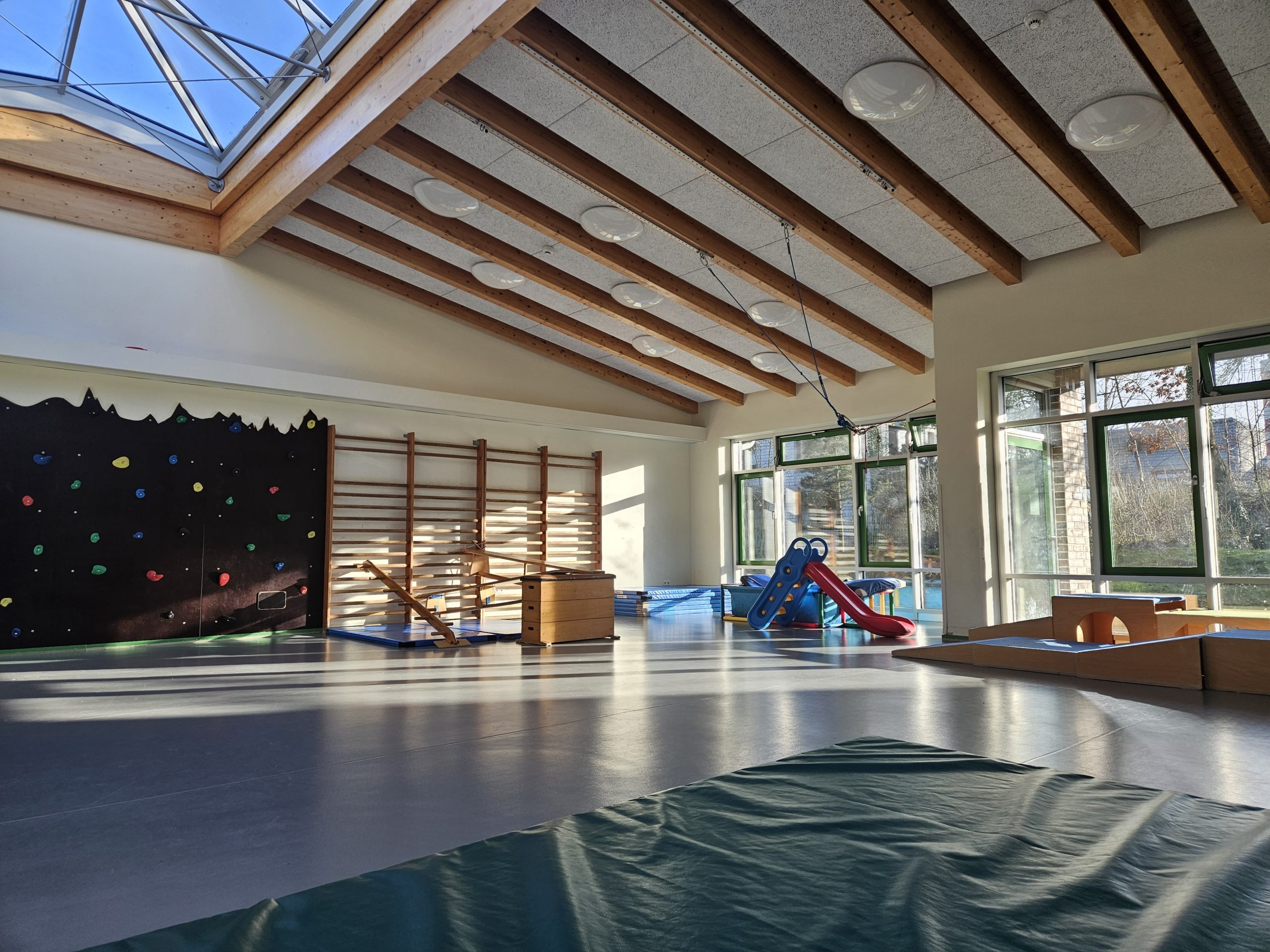 Aufgrund des teiloffenen Konzepts sind die Gruppenräume als „Themenräume“ gestaltet (Konstruieren, Kreativität, Sinneswahrnehmung, Rollenspiel). Ergänzt werden sie durch weitere Räume (große Turnhalle, Bücherei, Therapieraum, Werkstatt). Auch der Flur und das Leitungsbüro dürfen bespielt werden.